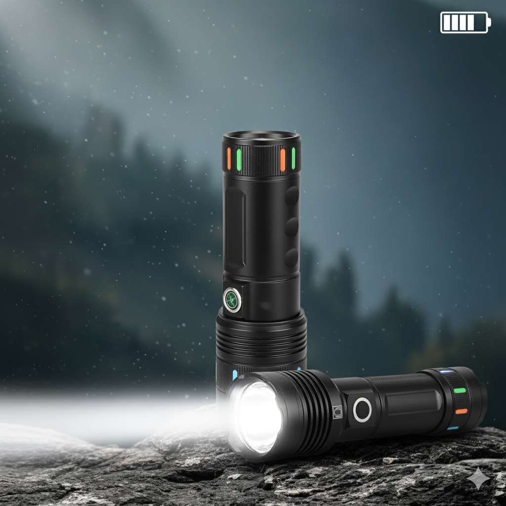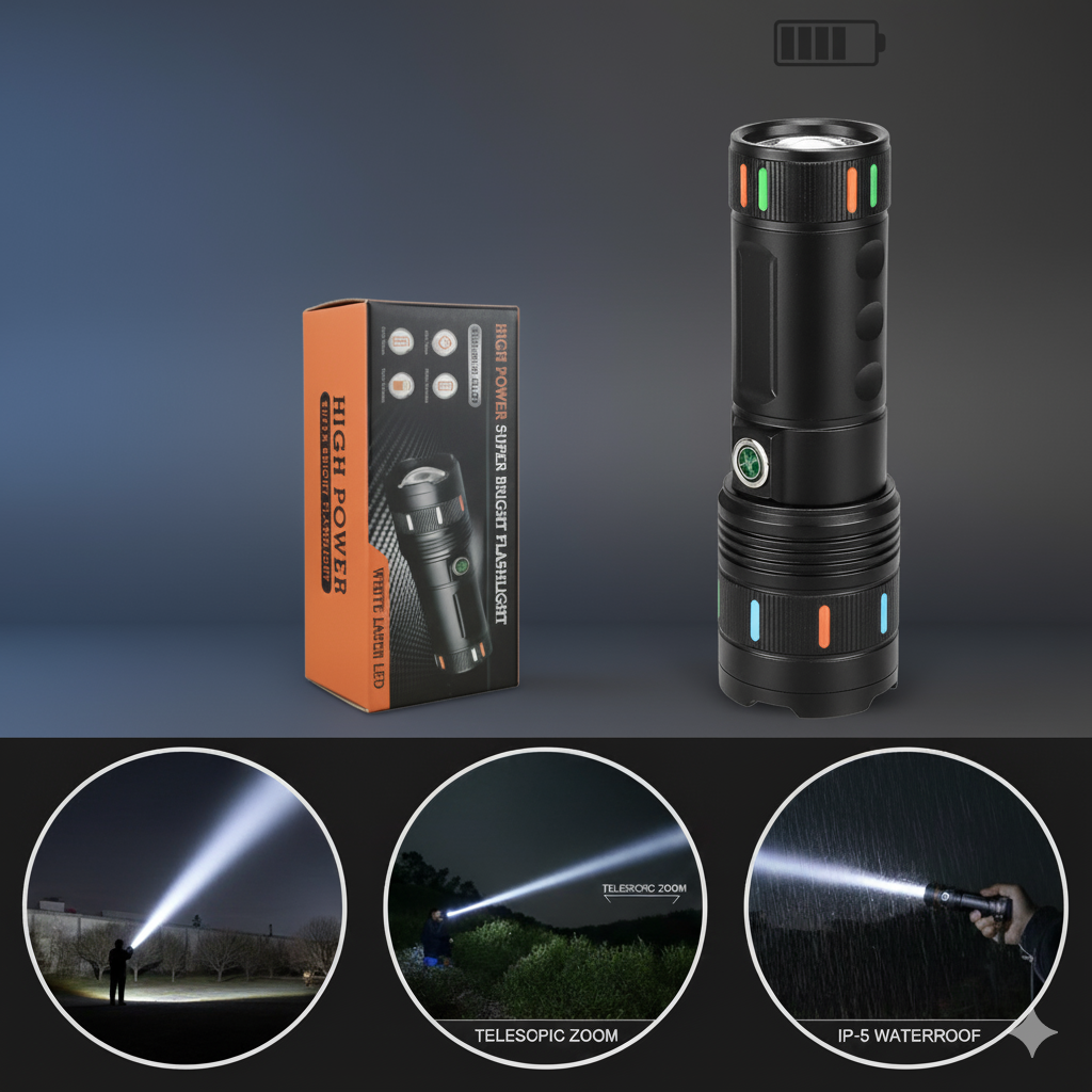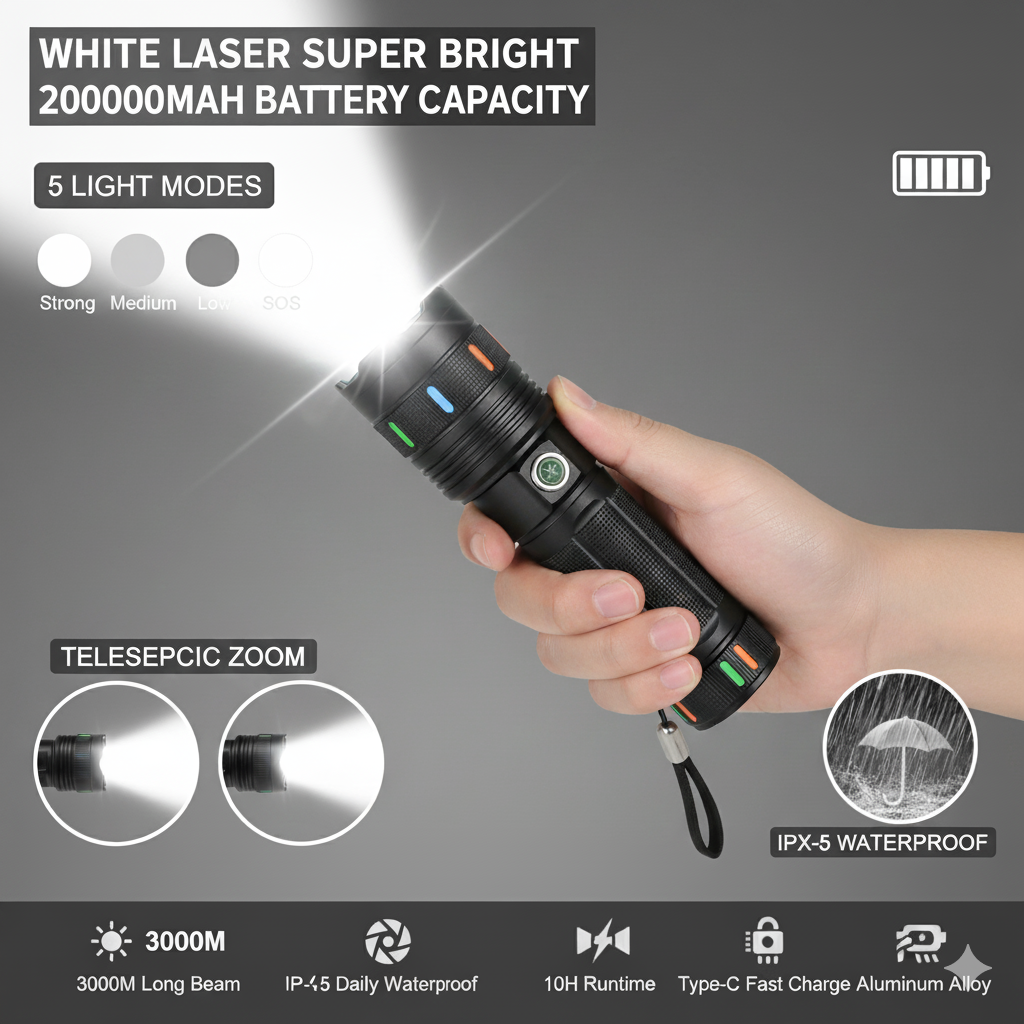 সুপার ব্রাইট হোয়াইট লেজার রিচার্জেবল টর্চলাইট (২০,০০০ mAh)